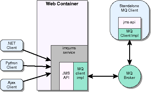 A new web component (imqums.war) can be deployed on any web container. That component serves as a bridge between the ums client and the JMS provider. The ums client sends the ums protocol (which uses http posts) to connect to the imqums service. That service uses standard JMS apis to connect to the MQ server (the broker).